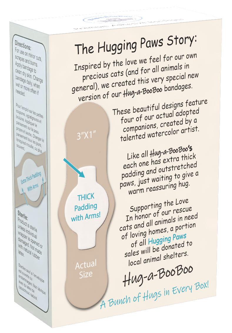 Every BooBoo Needs a Hug, so we created a bandage that gives one - and now our Amazing Hug-a-BooBoos feature four of our very own Precious Rescue Cats, beautifully painted by a talented waterolor artist! Like all Hug-a-BooBoos, the adorable cats on these Patented Premium adhesive bandages all have outstretched paws, just waiting to give a comforting hug to any scrape or cut! No booboo - no problem! You can wear one anyway! More than just another cute bandage, Hug-a-BooBoo’s unique premium padding has small extensions that give extra protection to sensitive areas around a wound. Our padding is also thicker than other brands for extra comfort and absorbency. That’s a special hug! Those Special Hugging Wings send a comforting message that truly connects with kids! A Bunch of Hugs in Every Box!