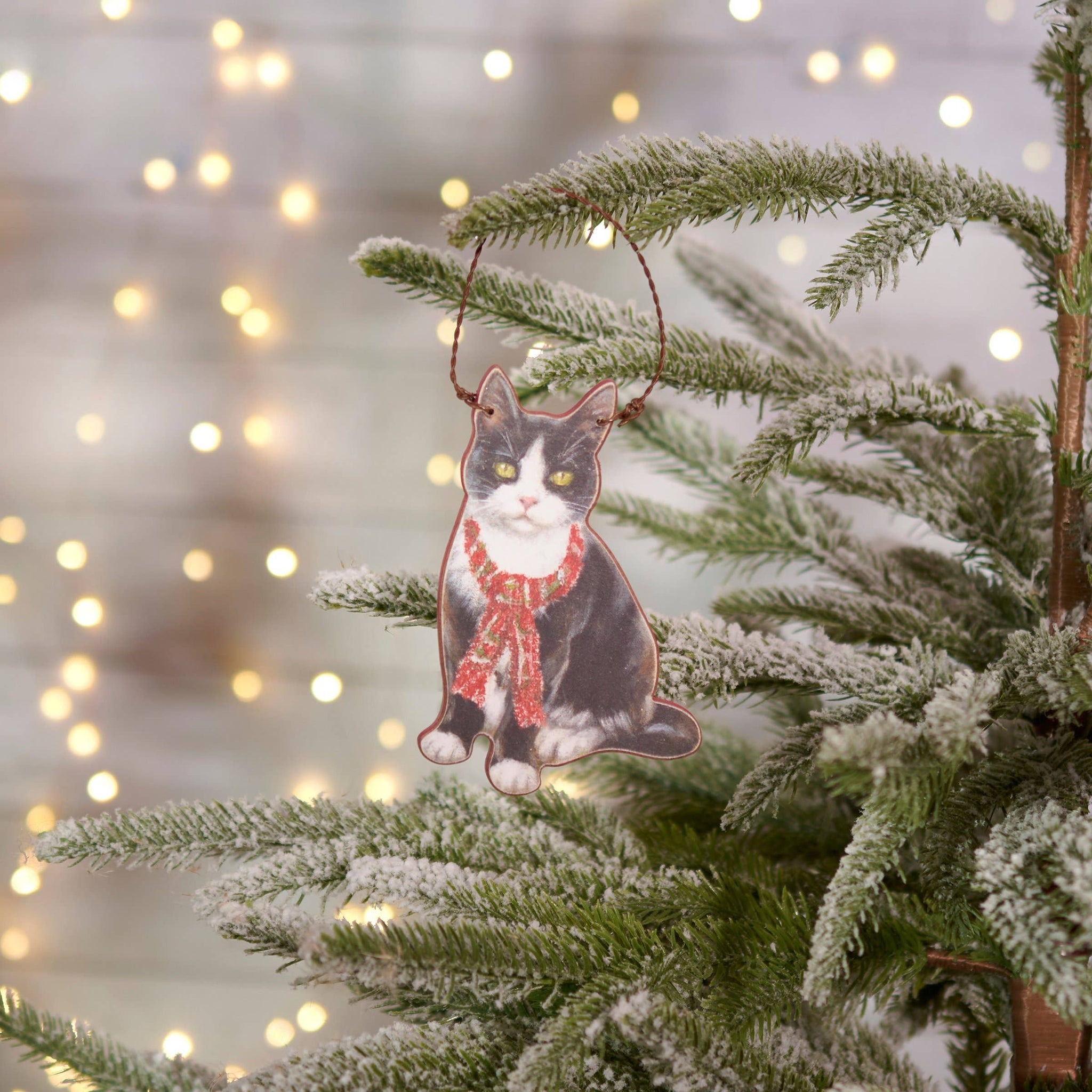 A wooden ornament from our Christmas Collection cut in the shape of the displayed holiday cat design featuring a charming tuxedo cat wearing a Christmas scarf. Design is replicated from original artwork painted onto burlap canvas, giving the art a unique depth and texture. Seasonal ornament features distressed details with coordinating red color on the sides and back where it can be personalized with owner's pet name and details. Our Tuxedo Cat Scarf ornament is easy to hang for display via attached twisted wire hanger. A fun holiday gift combining a love of Christmas and pets.
